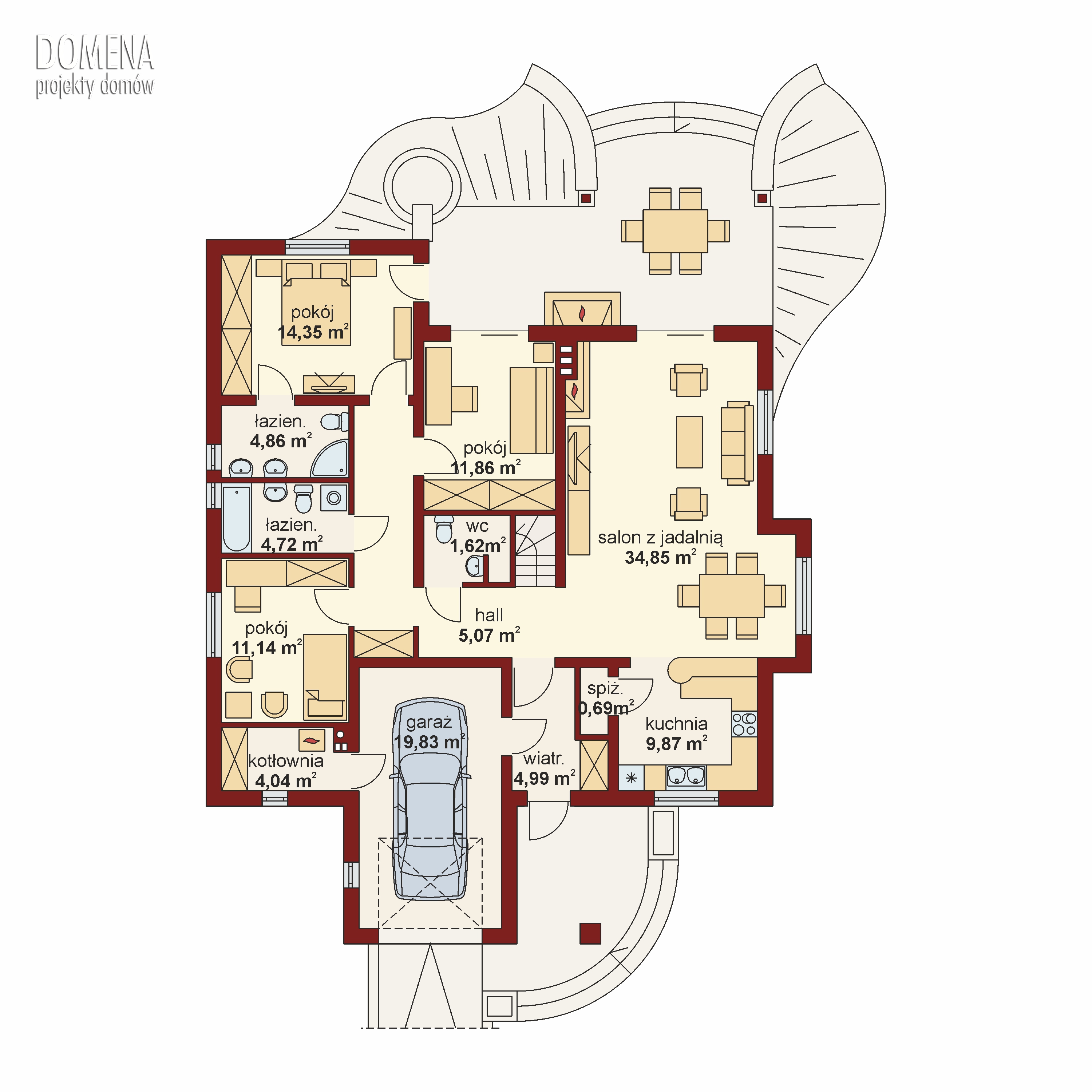 Atrakcyjny dom parterowy z poddaszem nieużytkowym. Już z zewnątrz zwraca uwagę niebanalnym wejściem od frontu budynku. Dom słoneczny, doświetlony praktycznie o każdej porze dnia. Posiada sensowne i pomysłowe oddzielenie strefy dziennej od nocnej, z możliwością całkowitego oddzielenia wyżej wymienionych stref. Dodatkową prywatność w strefie nocnej, zapewni gospodarzom oddzielna łazienka dostępna z sypialni rodziców. Kuchnia z wkomponowanym barkiem oraz spiżarnią, otwarta na jadalnie i salon. Niewątpliwym walorem domku jest obszerny, zadaszony taras z kominkiem – grillem. Pozwoli na wspólne spędzanie czasu na świeżym powietrzu, także podczas dżdżystych dni. Atutem tego praktycznego domku jest późniejsza możliwość adaptacji poddasza, około 40m2, na pomieszczenia mieszkalne.