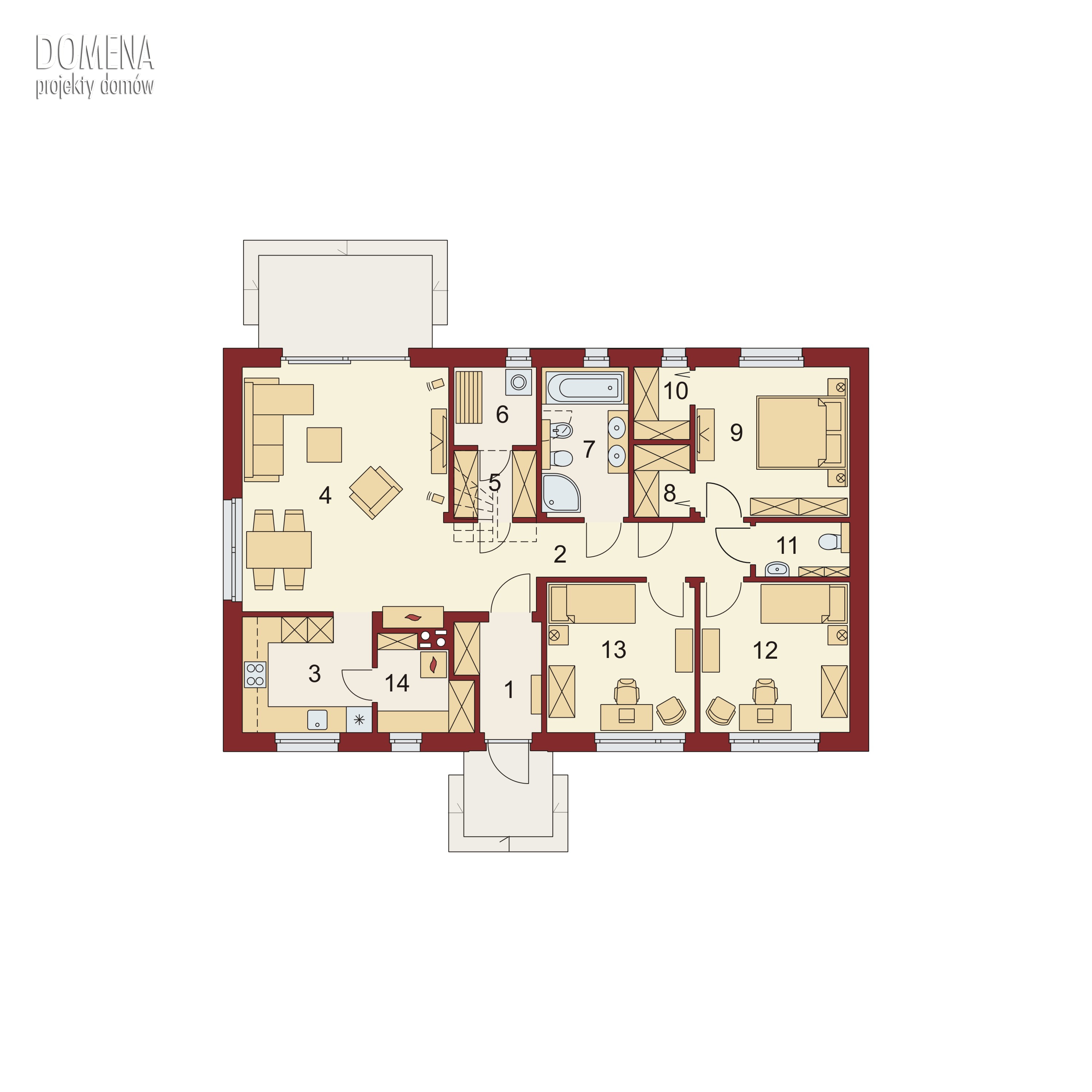 RODAN 3 to nowoczesny dom parterowy, stworzony z myślą o 4-osobowej rodzinie. Strefa dzienna składa się z przestronnego salonu połączonego z jadalnią, wydzielonej kuchni (którą można z łatwością połączyć z resztą wnętrza) oraz dostępnego z niej, pojemnego pomieszczenia gospodarczego. Strefa nocna obejmuje trzy sypialne (główną z własną garderobą) oraz podręczną toaletę. Część dzienną i nocną oddziela pasmo pomieszczeń pomocniczych z garderobą, pralnią oraz bogato wyposażoną łazienką.