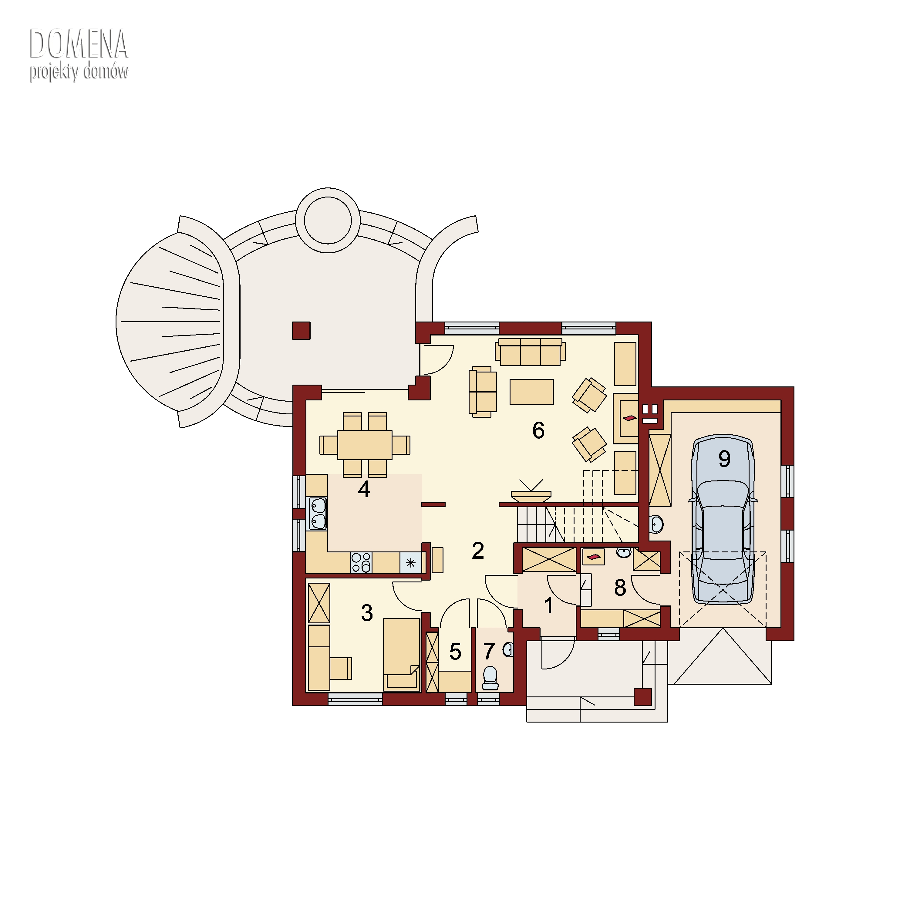 Wyjście na taras z podcieniem jest możliwe zarówno z jadalni jak i z pokoju dziennego. Na parterze znajduje się spiżarnia, wc oraz dodatkowy pokój, a także pomieszczenie gospodarcze, przez które można się dostać do garażu.