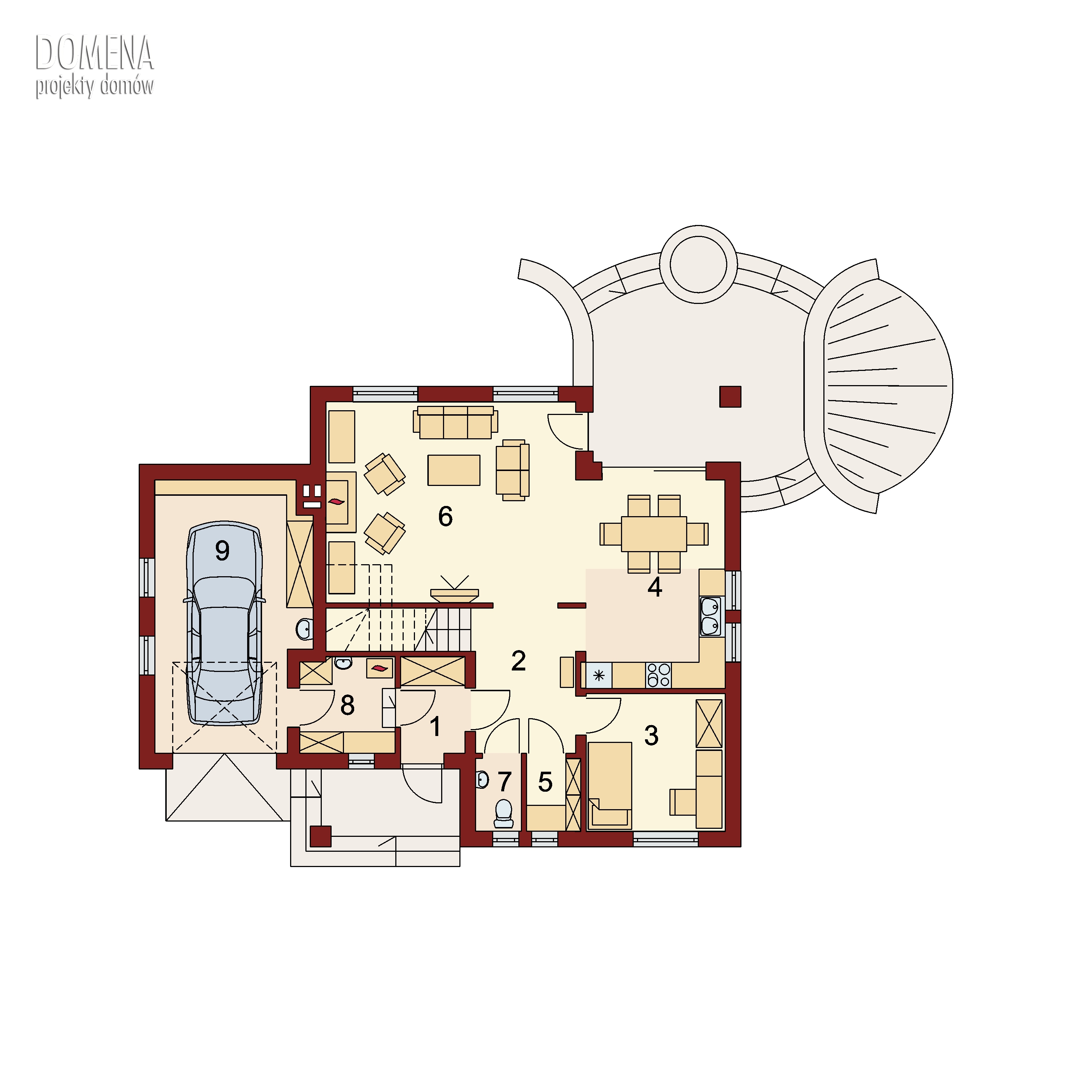 Wyjście na taras z podcieniem jest możliwe zarówno z jadalni jak i z pokoju dziennego. Na parterze znajduje się spiżarnia, wc oraz dodatkowy pokój, a także pomieszczenie gospodarcze, przez które można się dostać do garażu.