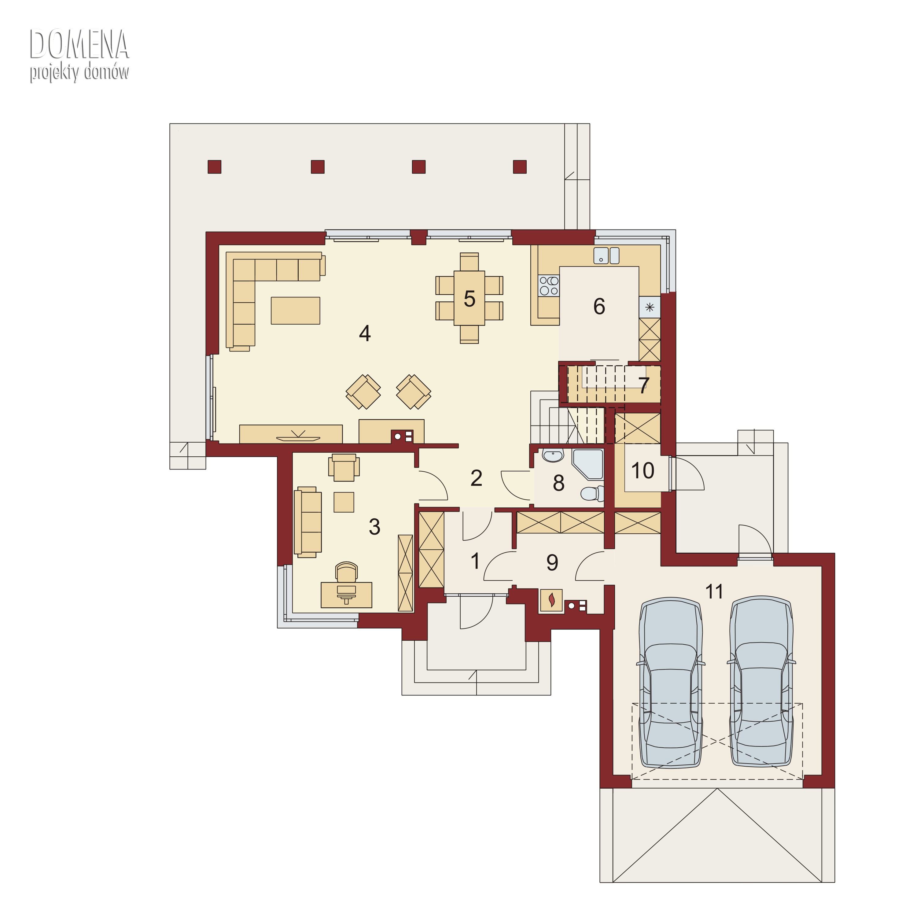 Sercem Simy jest przestronny i dobrze doświetlony salon, z którego wyjść można na zadaszony taras z dużym podcieniem. Salon płynnie przechodzi w wygodną jadalnię oraz połączoną ze spiżarnią ustawną kuchnię. Tę ostatnią, w ramach aranżacji można zamknąć ściankami działowymi. Dodatkowo na parterze znajdują się: wygodny pokój który można zaaranżować na sypialnię dla gości bądź gabinet, ogólnodostępna łazienka, ustawny wiatrołap z szafami wnękowymi, dwustanowiskowy garaż oraz dwa pomieszczenia gospodarcze z których jedno pełni funkcję kotłowni, a drugie schowka dostępnego z przestrzeni ogrodu.