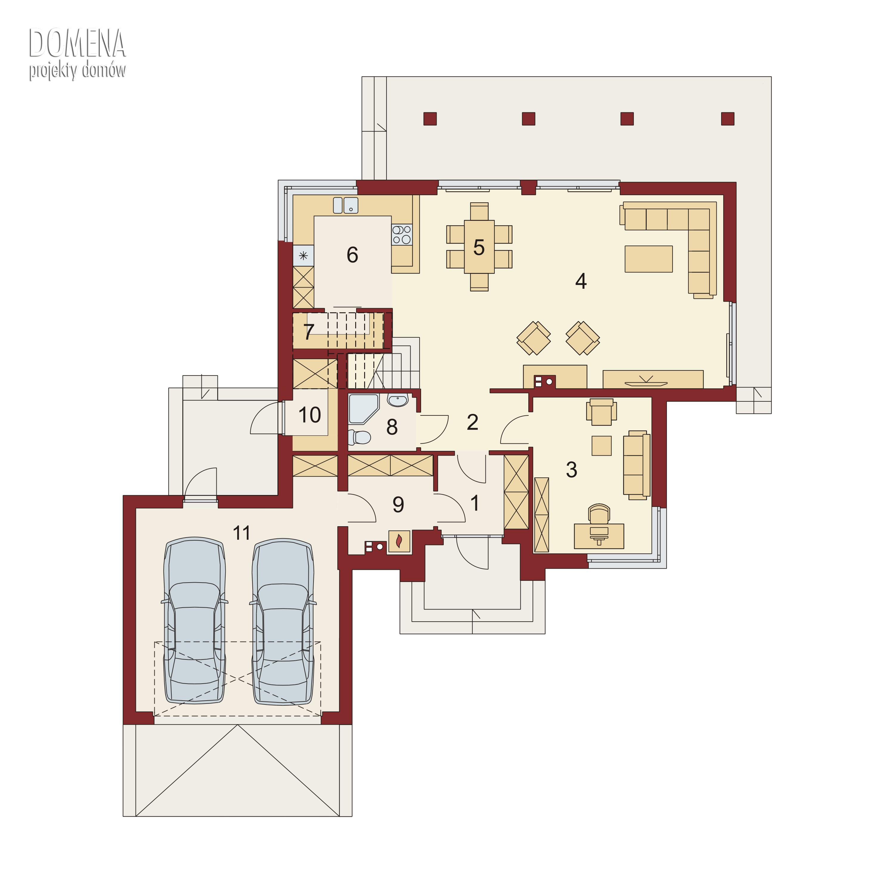 Sercem Simy jest przestronny i dobrze doświetlony salon, z którego wyjść można na zadaszony taras z dużym podcieniem. Salon płynnie przechodzi w wygodną jadalnię oraz połączoną ze spiżarnią ustawną kuchnię. Tę ostatnią, w ramach aranżacji można zamknąć ściankami działowymi. Dodatkowo na parterze znajdują się: wygodny pokój który można zaaranżować na sypialnię dla gości bądź gabinet, ogólnodostępna łazienka, ustawny wiatrołap z szafami wnękowymi, dwustanowiskowy garaż oraz dwa pomieszczenia gospodarcze z których jedno pełni funkcję kotłowni, a drugie schowka dostępnego z przestrzeni ogrodu.