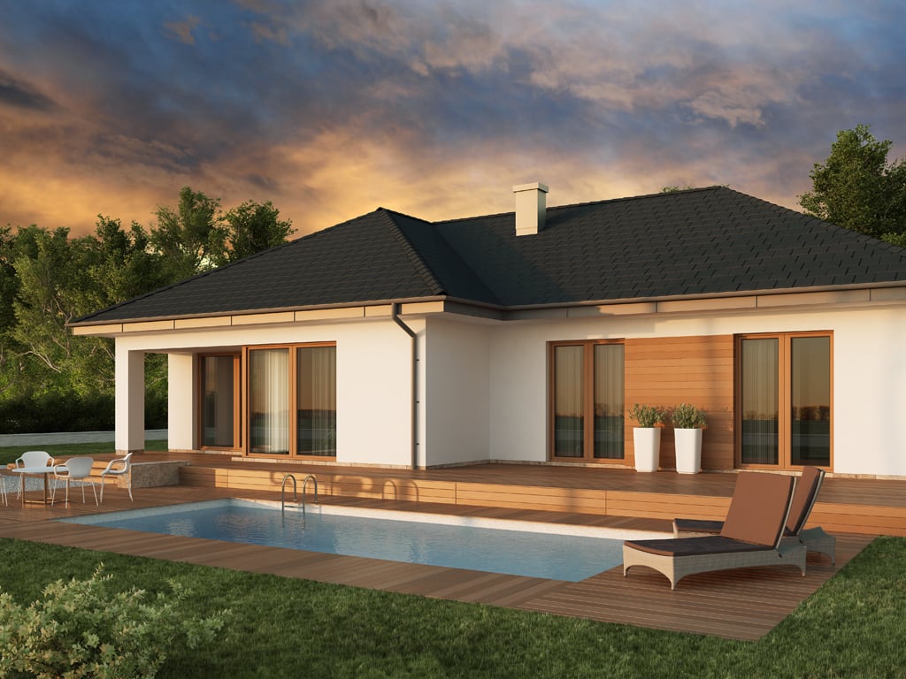Sokrates 2 to dom parterowy, przewidziany dla 4, 5-osobowej rodziny. Zastosowanie na elewacji tradycyjnych materiałów, takich jak drewno’ sprawia, iż jego w istocie współczesna forma zyskuje na przytulności i cieple. Doskonale także wpisuje się zarówno w krajobraz naturalny jak i już zabudowany. Wyraźnie zaznaczony jest podział na trzy strefy: dzienną, nocną oraz pomocniczą. Ma to korzystny wpływ na komfort mieszkania, jak również na prawidłowe gospodarowanie energią w domu (np. ogrzewanie), a co za tym idzie – na oszczędność. Strefa dzienna jest tak zaprojektowana, iż składające się na nią salon, jadalnia i kuchnia z praktyczną spiżarką, pomimo braku trwałych przegród, nie kolidują ze sobą, a wręcz bardzo dobrze uzupełniają się funkcjonalnie. Zwolennicy kuchni zamkniętych mogą swobodnie wydzielić ją ścianką działową. Część nocna to trzy sypialnie, przy czym każda z osobnym wyjściem na taras oraz indywidualną garderobą. Jedna z nich posiada także własną łazienkę. Garderobę naprzeciwko wejścia głównego można otworzyć bądź na sypialnię, bądź na hall główny domu. Można, usuwając ściankę działową, powiększyć powierzchnię sypialni. Jest również możliwość usytuowania w jej miejscu schodów prowadzących na strych, który po adaptacji można wykorzystać jako dodatkową sypialnię, pokój gościnny czy np. pokój hobby.