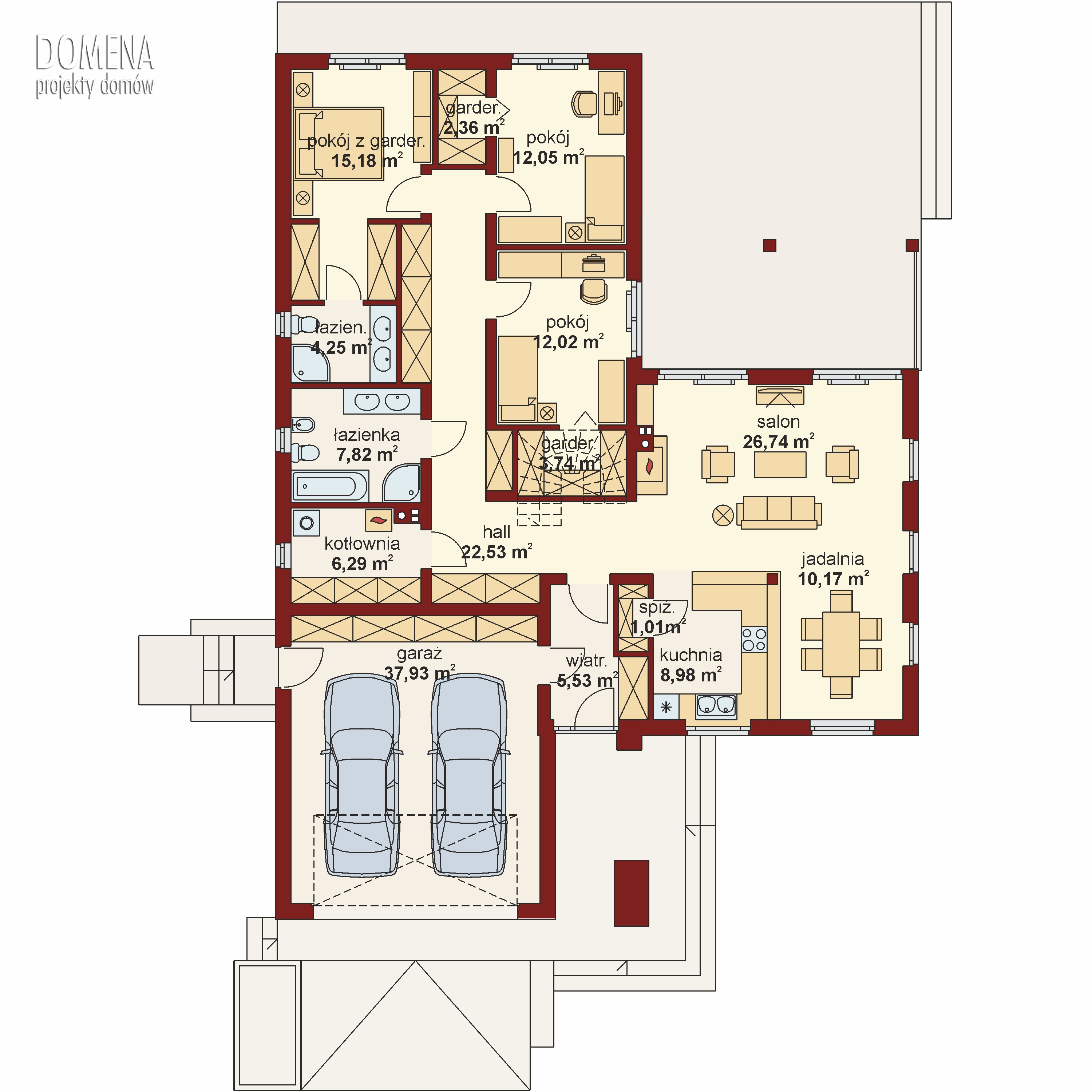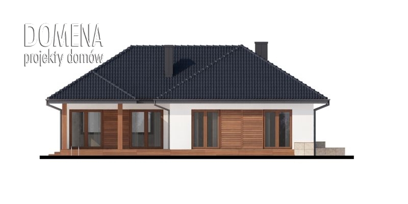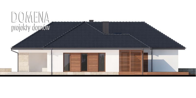 Sokrates 2 to dom parterowy, przewidziany dla 4, 5-osobowej rodziny. Zastosowanie na elewacji tradycyjnych materiałów, takich jak drewno’ sprawia, iż jego w istocie współczesna forma zyskuje na przytulności i cieple. Doskonale także wpisuje się zarówno w krajobraz naturalny jak i już zabudowany. Wyraźnie zaznaczony jest podział na trzy strefy: dzienną, nocną oraz pomocniczą. Ma to korzystny wpływ na komfort mieszkania, jak również na prawidłowe gospodarowanie energią w domu (np. ogrzewanie), a co za tym idzie – na oszczędność. Strefa dzienna jest tak zaprojektowana, iż składające się na nią salon, jadalnia i kuchnia z praktyczną spiżarką, pomimo braku trwałych przegród, nie kolidują ze sobą, a wręcz bardzo dobrze uzupełniają się funkcjonalnie. Zwolennicy kuchni zamkniętych mogą swobodnie wydzielić ją ścianką działową. Część nocna to trzy sypialnie, przy czym każda z osobnym wyjściem na taras oraz indywidualną garderobą. Jedna z nich posiada także własną łazienkę. Garderobę naprzeciwko wejścia głównego można otworzyć bądź na sypialnię, bądź na hall główny domu. Można, usuwając ściankę działową, powiększyć powierzchnię sypialni. Jest również możliwość usytuowania w jej miejscu schodów prowadzących na strych, który po adaptacji można wykorzystać jako dodatkową sypialnię, pokój gościnny czy np. pokój hobby.