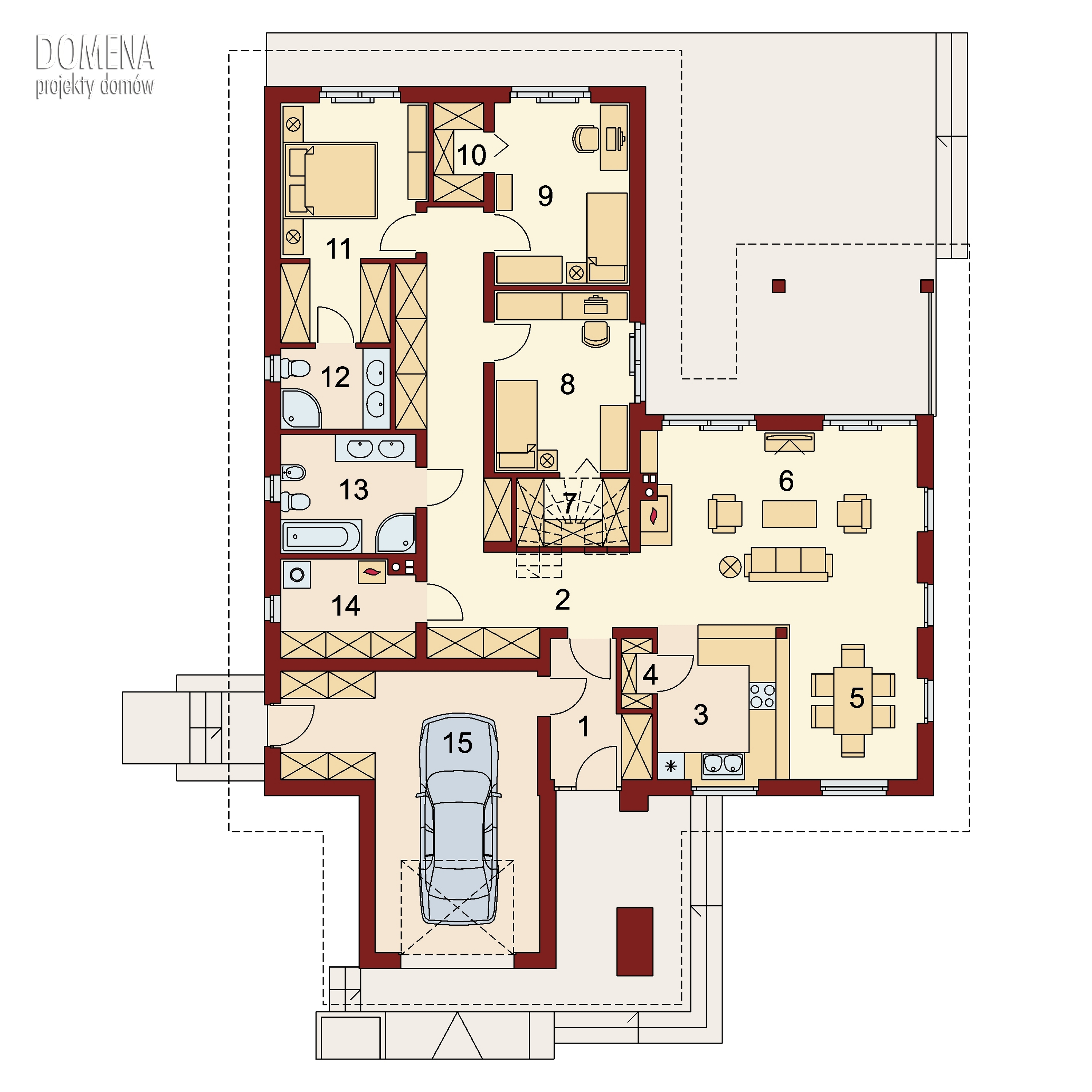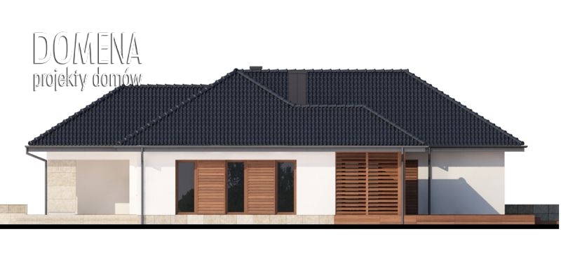 Sokrates to dom parterowy, przewidziany dla 4, 5-osobowej rodziny. Zastosowanie na elewacji tradycyjnych materiałów, takich jak drewno’ sprawia, iż jego w istocie współczesna forma zyskuje na przytulności i cieple. Doskonale także wpisuje się zarówno w krajobraz naturalny jak i już zabudowany. Wyraźnie zaznaczony jest podział na trzy strefy: dzienną, nocną oraz pomocniczą. Ma to korzystny wpływ na komfort mieszkania, jak również na prawidłowe gospodarowanie energią w domu (np. ogrzewanie), a co za tym idzie – na oszczędność. Strefa dzienna jest tak zaprojektowana, iż składające się na nią salon, jadalnia i kuchnia z praktyczną spiżarką, pomimo braku trwałych przegród, nie kolidują ze sobą, a wręcz bardzo dobrze uzupełniają się funkcjonalnie. Zwolennicy kuchni zamkniętych mogą swobodnie wydzielić ją ścianką działową. Część nocna to trzy sypialnie, przy czym każda z osobnym wyjściem na taras oraz indywidualną garderobą. Jedna z nich posiada także własną łazienkę. Garderobę naprzeciwko wejścia głównego można otworzyć bądź na sypialnię, bądź na hall główny domu. Można, usuwając ściankę działową, powiększyć powierzchnię sypialni. Jest również możliwość usytuowania w jej miejscu schodów prowadzących na strych, który po adaptacji można wykorzystać jako dodatkową sypialnię, pokój gościnny czy np. pokój hobby.