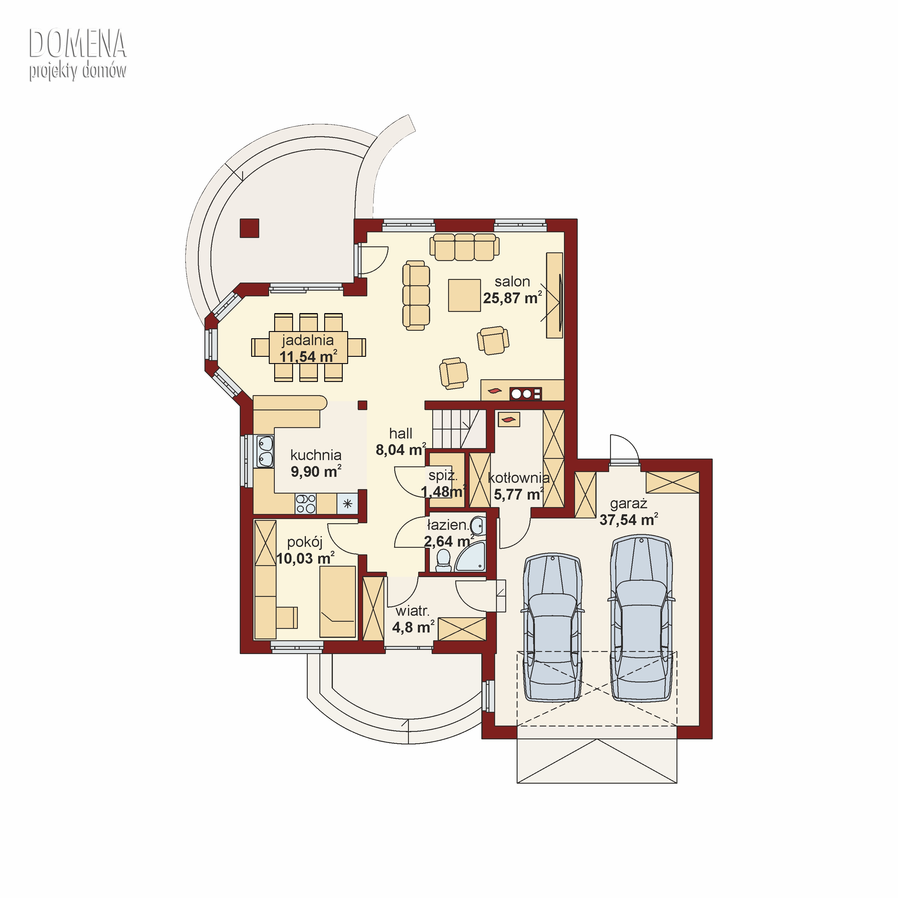 Dom jednorodzinny przeznaczony dla 4-5 osobowej rodzinny , o tradycyjnej bryle. Uniwersalna forma domu, pozwoli na wkomponowanie się w każde otoczenie. Parter to przede wszystkim otwarte, przestrzenne i słoneczne wnętrze. Powierzchnia wiatrołapu pozwoli na funkcjonalne wykorzystanie przestrzeni dodatkowymi szafami pod zabudowę. Usytuowanie spiżarni naprzeciw kuchni doceni każda Pani domu. Dodatkowy pokój umieszczony w pobliżu funkcjonalnej łazienki może pełnić rolę pokoju gościnnego, co sprawi wydzielenie strefy intymnej dla gościa i domowników. Poddasze to trzy, przestronne pokoje z balkonami oraz ogólnodostępna, wygodna łazienka. Zaletą pokoju przeznaczonego dla gospodarzy jest dostęp do przylegającej do pokoju garderoby.