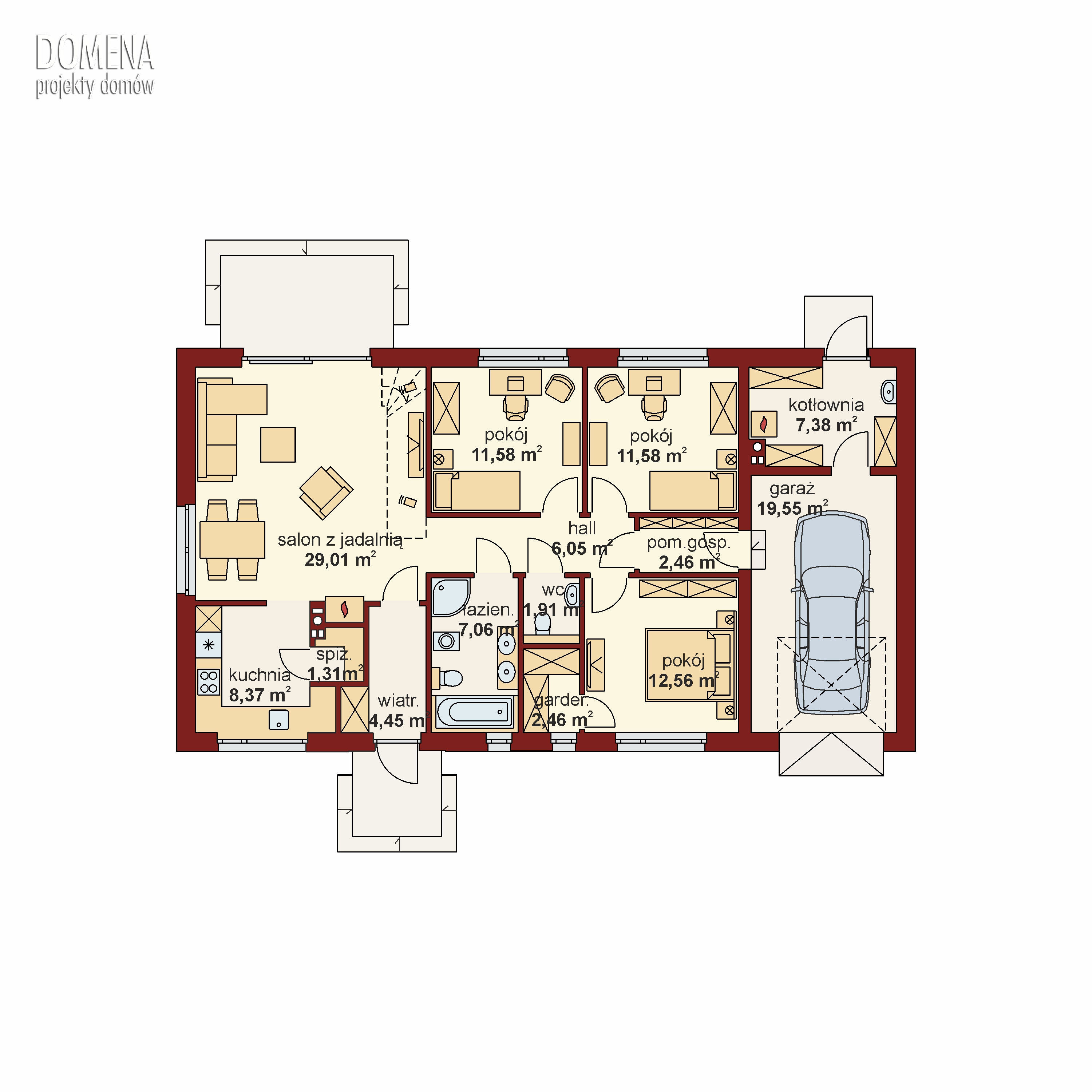 Strefa dzienna składa się z przestronnego salonu połączonego z jadalnią i oddzielona kuchnią (którą można z łatwością zupełnie zamknąć lub połączyć z częścią główną) uzupełniona o spiżarnię. Strefa nocna obejmuje trzy sypialne (główną z własną garderobą) oraz podręczne pomieszczenie gospodarcze zapewniające wygodny dostęp do garażu i pojemnej kotłowni. Część dzienną i nocną oddziela bogato wyposażona łazienka i praktyczna dodatkowa toaleta.