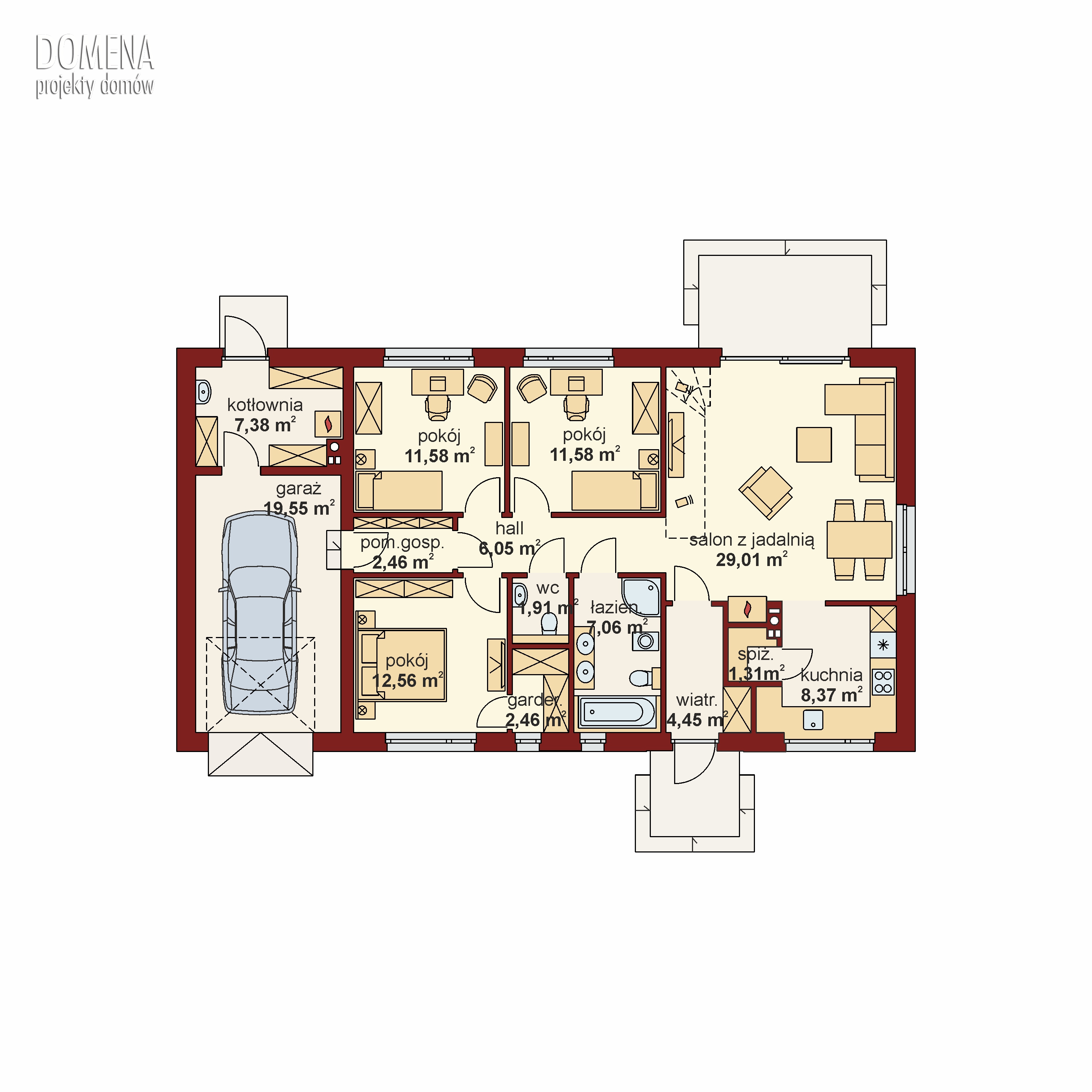 Zastosowane rozwiązanie konstrukcyjne – prefabrykowane drewniane wiązary dachowe – pozwala na swobodną aranżację pomieszczeń dzięki eliminacji wewnętrznych ścian nośnych.