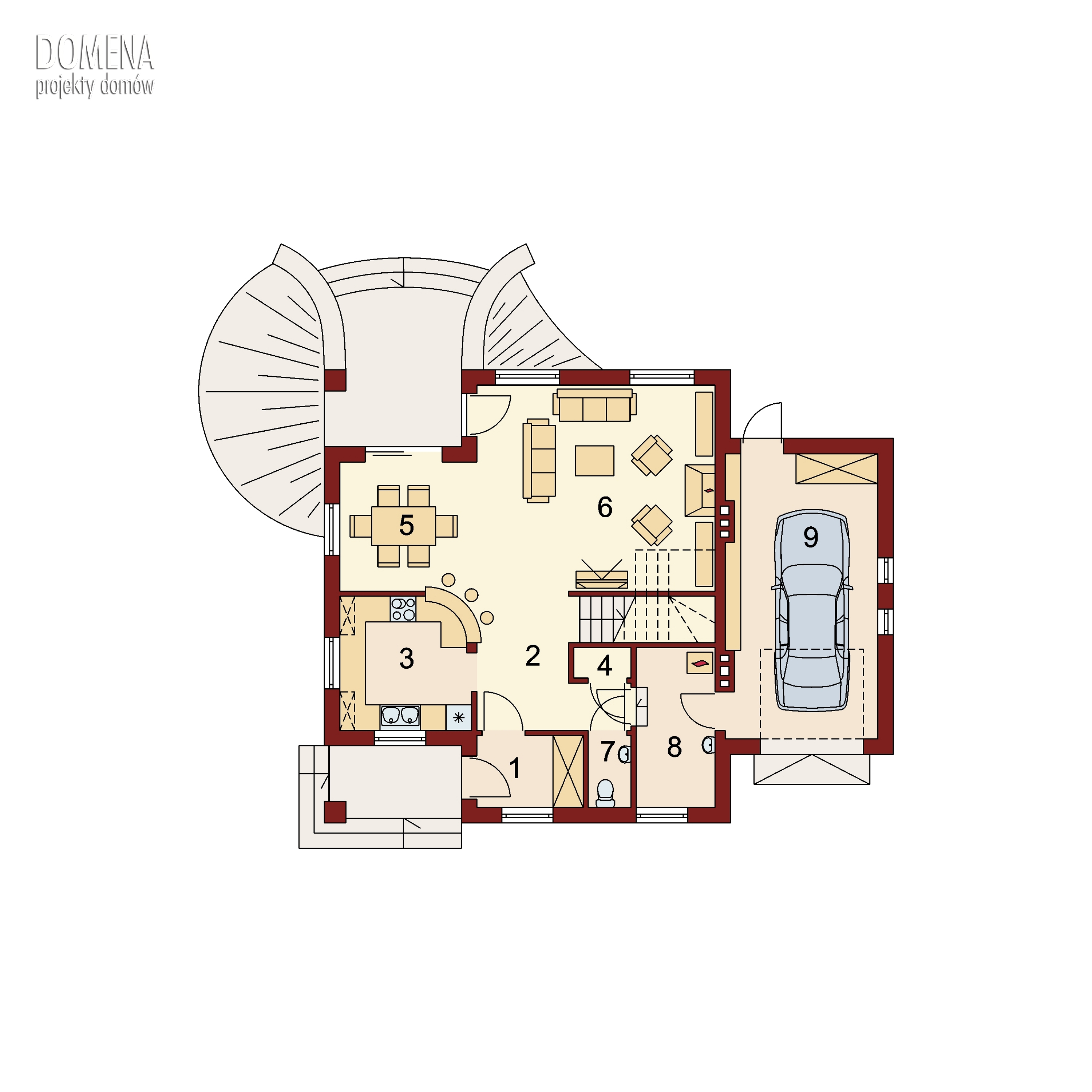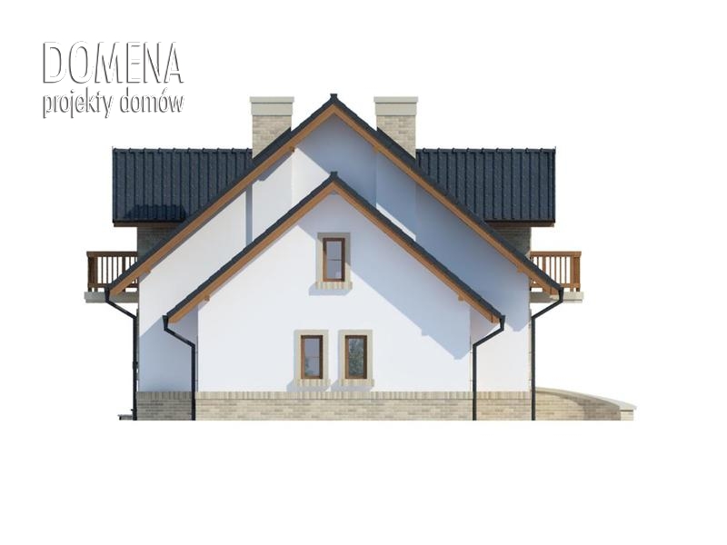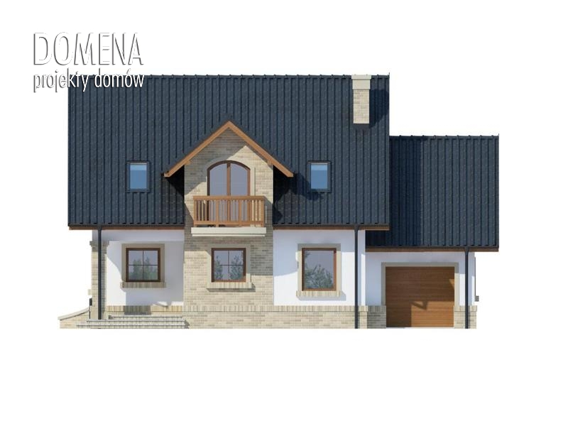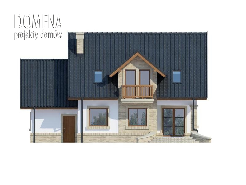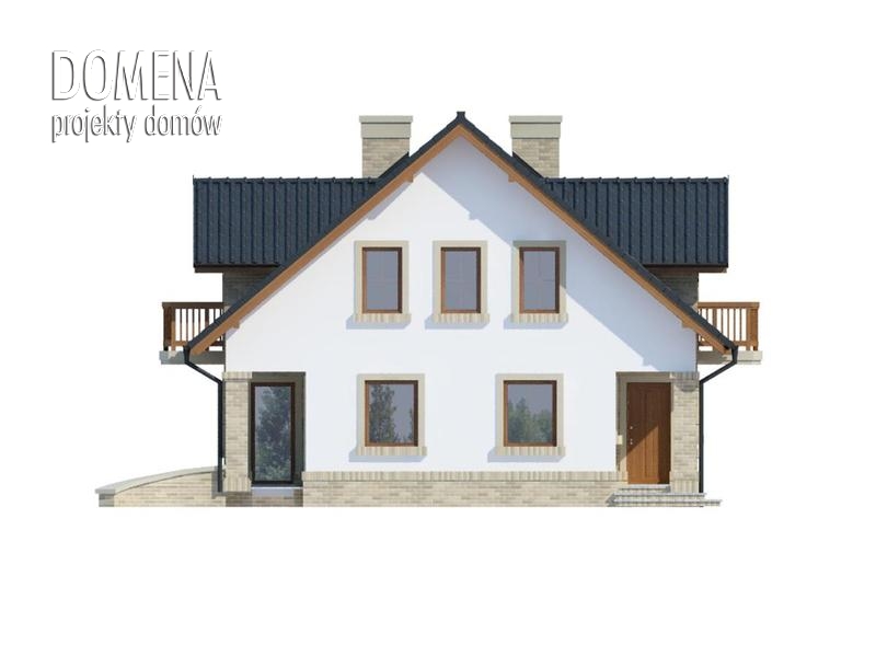 Funkcjonalny dom dla 4 osobowej rodziny o stosunkowo małej kubaturze przez co łatwy w utrzymaniu i nie sprawiający problemów przy budowie. Wejście domu skrywa praktyczny podcień, którego lustrzane odbicie od strony ogrodu dało częściowe zadaszenie tarasu. Na parterze mamy strefę mieszkalną, w której dzięki aranżacji architektonicznej jest wydzielony salon z kominkiem, jadalnie i dużą kuchnię z efektownym barkiem, oraz część gospodarczą z garażem dostępnym również od strony ogrodu i pomieszczeniem gdzie umiejscowiony jest piec grzewczy( po drugiej stronie pomieszczenia można umieścić pralkę). Poddasze domu posiada klarowny podział na trzy sypialnie, oraz dostępne z korytarza garderobę i łazienkę. Nieużytkowy strych, będący do dyspozycji ze spocznika schodów, można łatwo przekształcić w dodatkowy pokój zwiększając przez to powierzchnię mieszkalną i ergonomiczność domu.