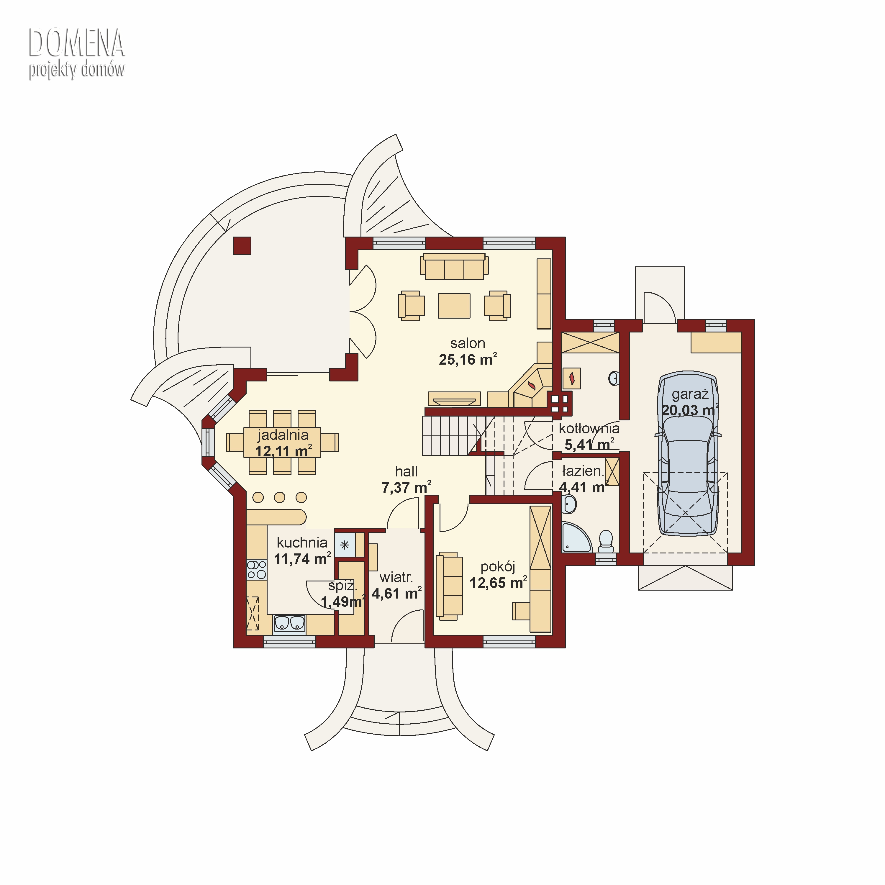 Wygodny dom dla 4-5 osobowej rodziny z ładnymi lukarnami wyposażonymi w balkony. Spora liczba przeszkleń na parterze zapewnia dobre doświetlenie światłem słonecznym całej przestrzeni, w której są wydzielone: salon z efektownym, narożnym kominkiem, jadalnia ,oraz kuchnia z barkiem od strony pokoju. Znajdująca się w kuchni spiżarkę możemy zamienić na ciąg wysokich szafek, a same pomieszczenie kuchenne zamknąć ścianką działową, bądź drzwiami przesuwnymi. Dodatkowy, znajdujący się na prawo od wiatrołapu, pokój ,może być sypialnią, pokojem gościnnym, czy gabinetem. Cześć gospodarcza jest czytelnie oddzielona od reszty pomieszczeń i w pełni funkcjonalna. Na poddaszu umieszczono trzy sypialnie w tym jedną z garderobą, oraz łazienkę mieszczącą komfortowej wielkości wannę oraz pozostałą ceramikę sanitarną. Z klatki schodowej można wejść na strych, który przy niewielkim nakładzie adaptacyjnym stanie się pomieszczeniem ,którego być może zabrakło (pokój hobby, siłownia, dodatkowa sypialnia itd.).