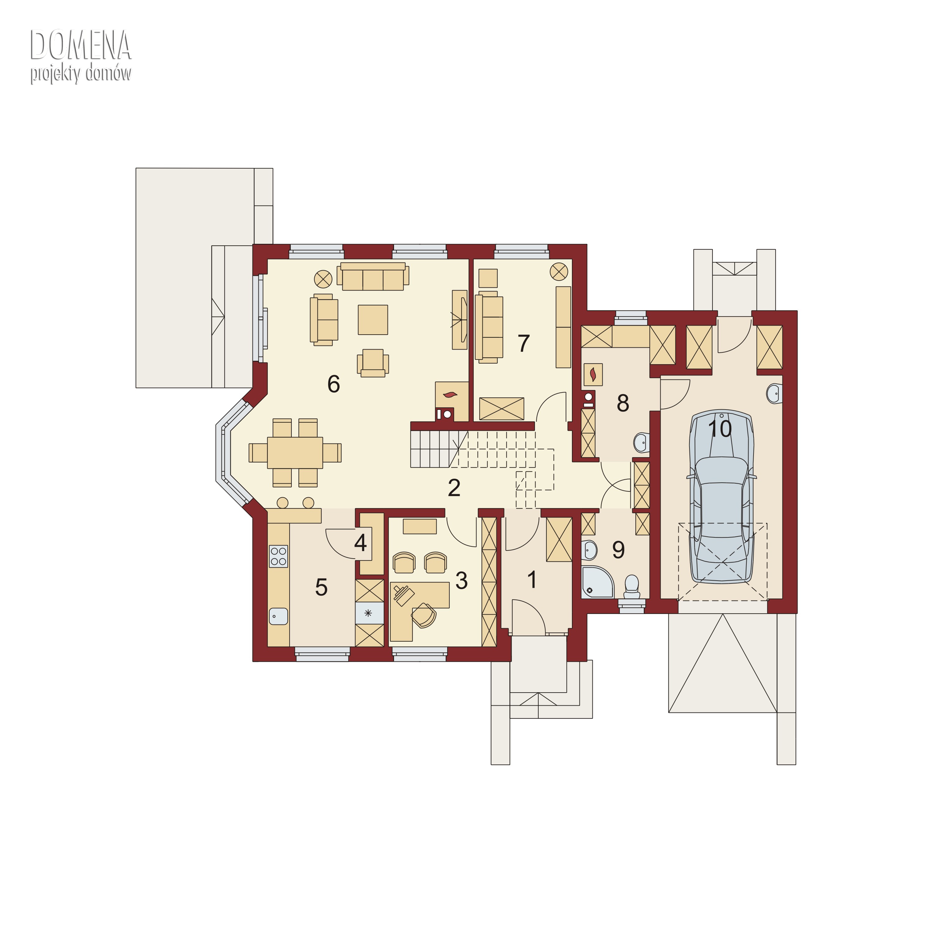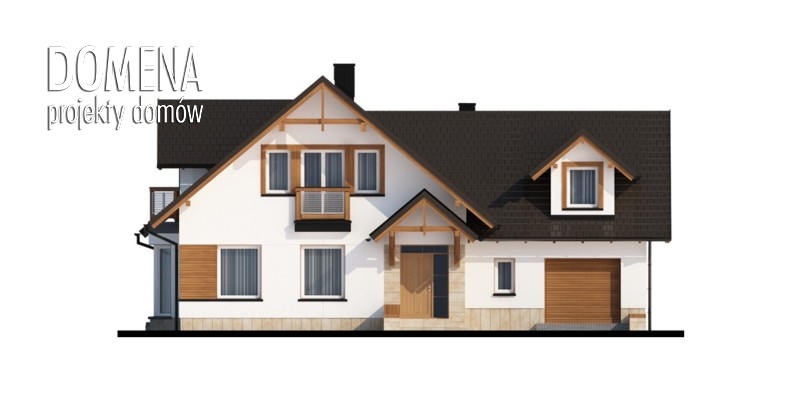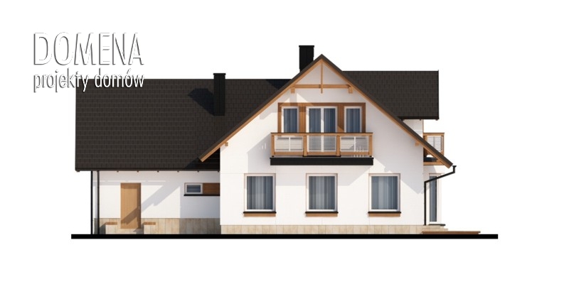 Tymon to dom idealny dla 4-6 osobowej rodziny, o tradycyjnej bryle i wyważonych proporcjach. Głównym punktem parteru jest salon z bezpośrednim wyjściem na taras, stopniowo przechodzący w część jadalnianą, usytuowaną w przytulnym wykuszu. Praktyczny barek oddziela tę przestrzeń od kuchni. Kuchnię można również zmodyfikować: powiększyć, przez likwidację spiżarki, bądź też przekształcić w zamkniętą, dzięki dostawieniu ścianki działowej. Korzystnie pod względem funkcjonalnym, bezpośrednio przy wejściu głównym, umieszczone są dwa pomieszczenia mogące służyć za pokój gościnny oraz gabinet. Rezygnując z jednego z nich możemy w znaczący sposób powiększyć powierzchnię salonu. Poddasze to strefa nocna. Spośród trzech sypialni, dwie z nich mają bezpośrednie wyjście na balkon, a jedna dodatkowo indywidualną garderobę. Położony nad garażem strych możemy przeznaczyć na dodatkowe pomieszczenie mieszkalne.