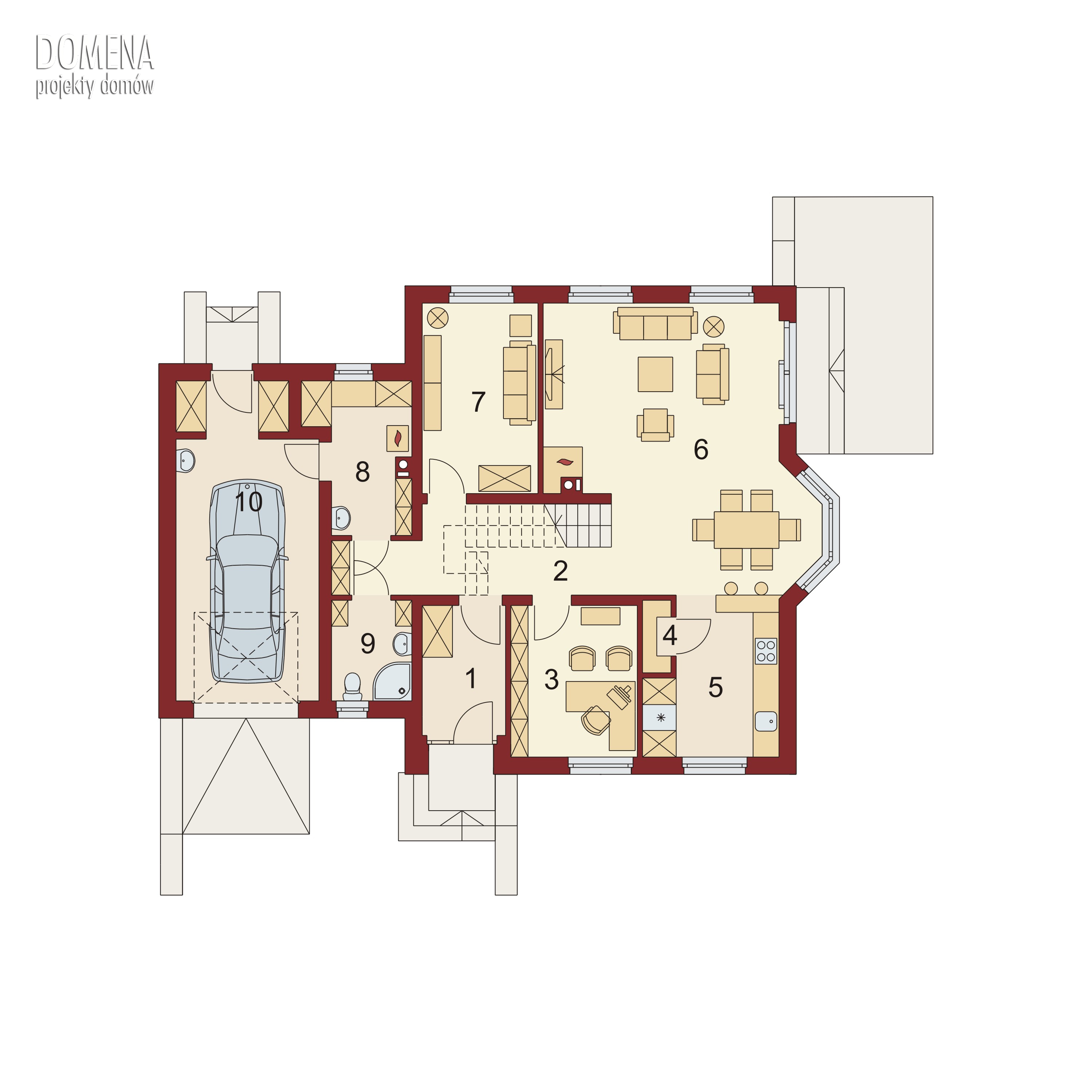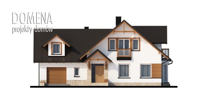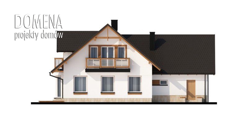 Tymon to dom idealny dla 4-6 osobowej rodziny, o tradycyjnej bryle i wyważonych proporcjach. Głównym punktem parteru jest salon z bezpośrednim wyjściem na taras, stopniowo przechodzący w część jadalnianą, usytuowaną w przytulnym wykuszu. Praktyczny barek oddziela tę przestrzeń od kuchni. Kuchnię można również zmodyfikować: powiększyć, przez likwidację spiżarki, bądź też przekształcić w zamkniętą, dzięki dostawieniu ścianki działowej. Korzystnie pod względem funkcjonalnym, bezpośrednio przy wejściu głównym, umieszczone są dwa pomieszczenia mogące służyć za pokój gościnny oraz gabinet. Rezygnując z jednego z nich możemy w znaczący sposób powiększyć powierzchnię salonu. Poddasze to strefa nocna. Spośród trzech sypialni, dwie z nich mają bezpośrednie wyjście na balkon, a jedna dodatkowo indywidualną garderobę. Położony nad garażem strych możemy przeznaczyć na dodatkowe pomieszczenie mieszkalne.
